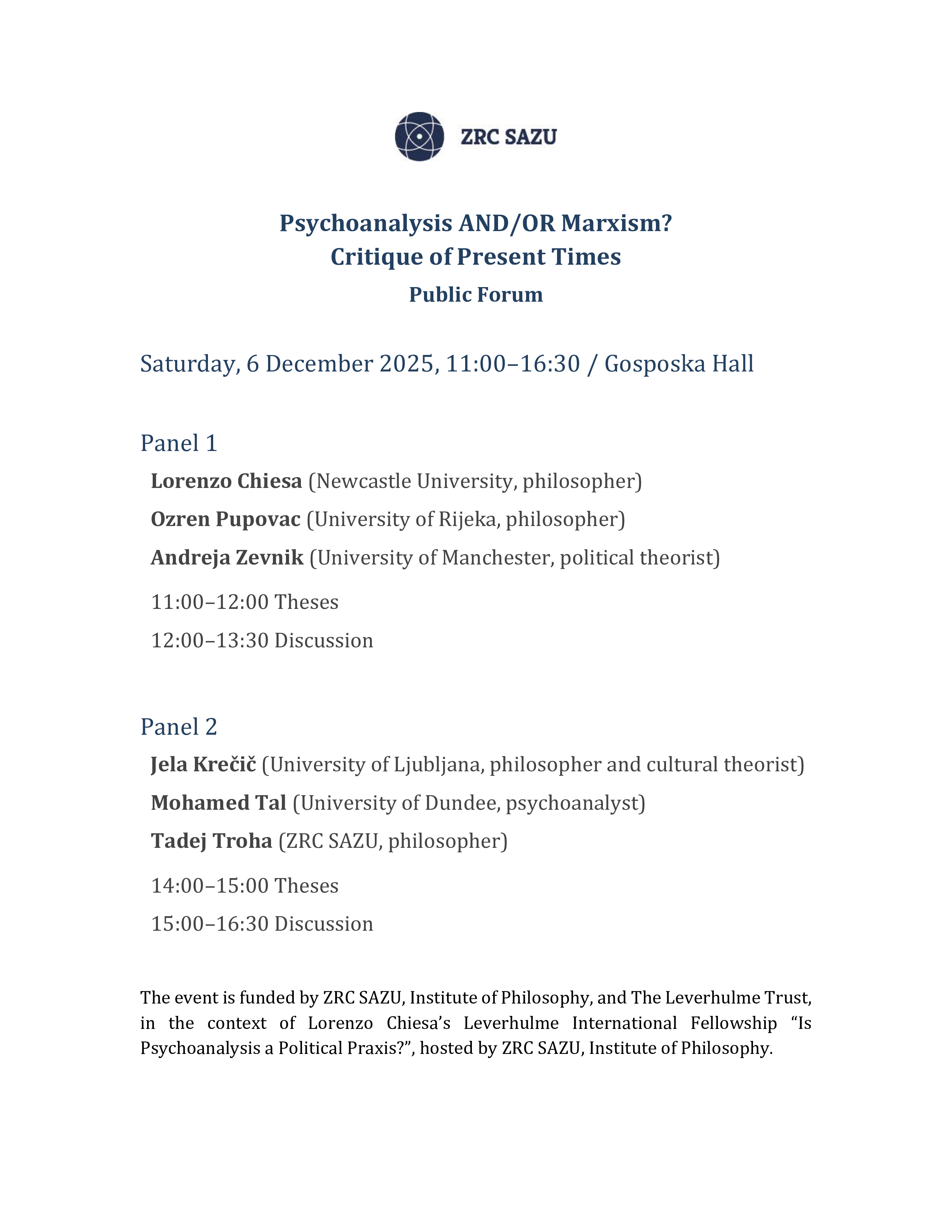 The Institute of Philosophy ZRC SAZU invites you to a public forum Psychoanalysis AND/OR Marxism? Critique of Present Times, organized on the occasion of the research visit of Lorenzo Chiesa from Newcastle University, UK.