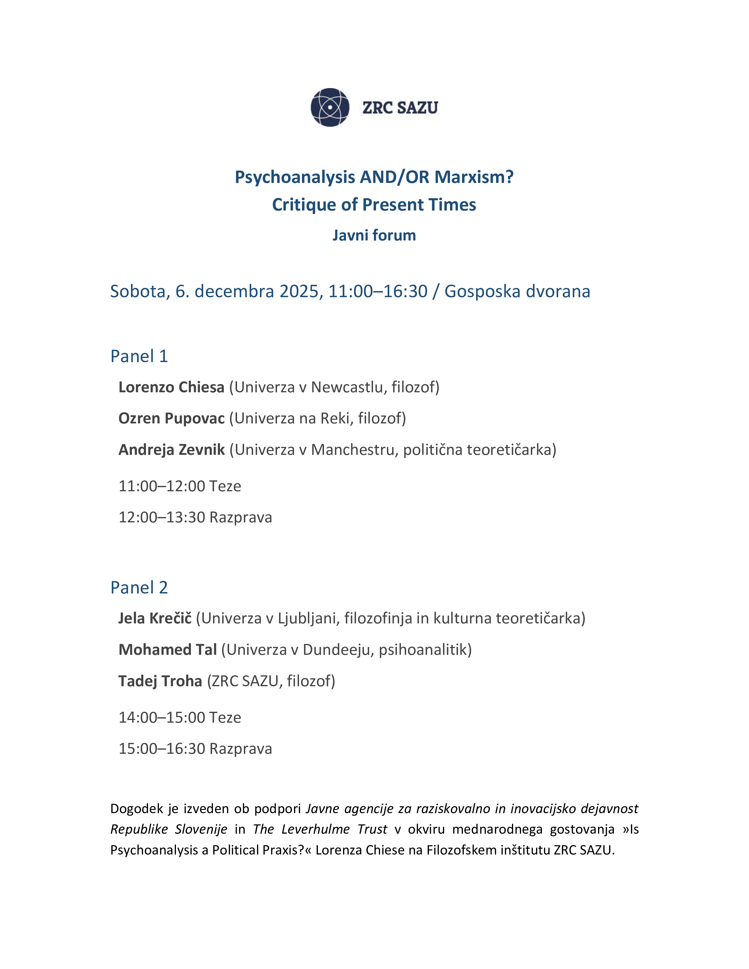 Filozofski inštitut ZRC vas vabi na javni forum Psychoanalysis AND/OR Marxism? Critique of Present Times, organiziran ob raziskovalnem obisku Lorenza Chiese z Univerze v Newcastlu (Združeno kraljestvo).